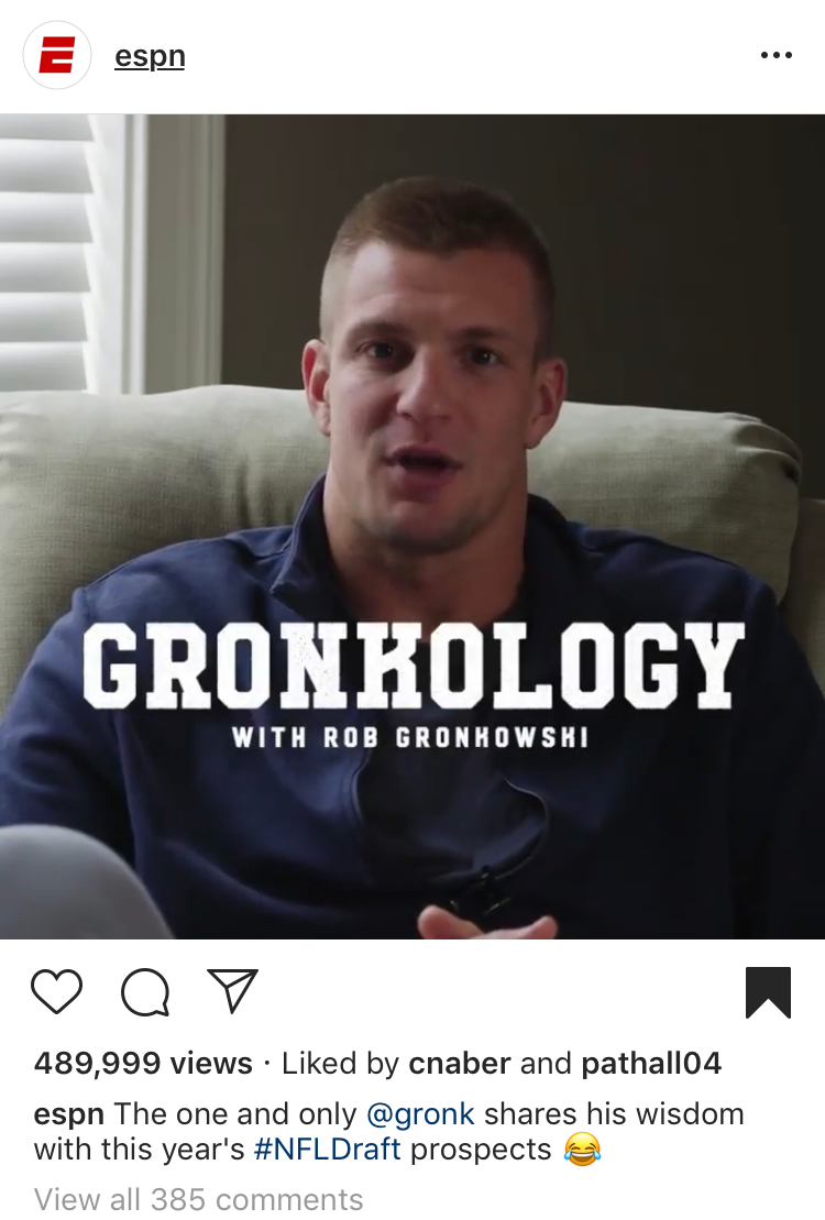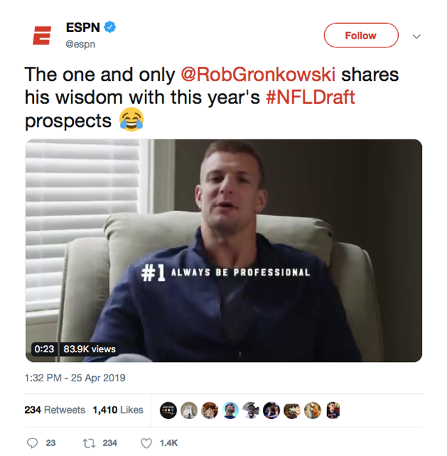 This was showcased on many platforms all throughout the lead up to the 2019 NFL Draft, including Good Morning America, ESPN, and multiple ESPN social handles. With more than a combined 4 million impressions, I'd say Gronk's words were heard!